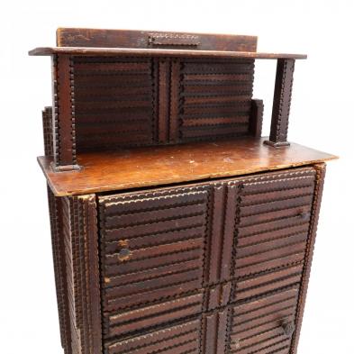 Early 20th century, notch carving over pine, two large drawer form, each drawer with carved double panels with upper shelf supported by notch carved columns.