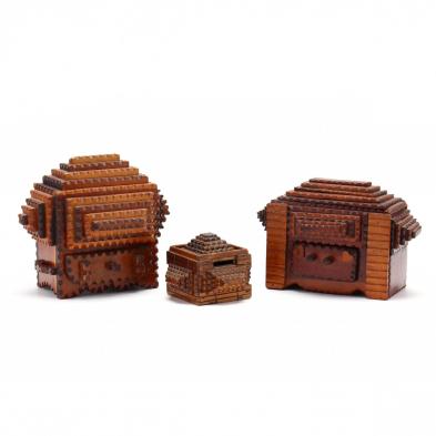 1950s or later, one constructed as a bank; the second with sliding lid and lower drawer; the third with lift up lid and lower drawer, relief carved heart motif.