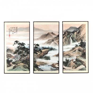 20th century, ink and watercolors on paper, a horizontal format landscape, now cut and framed in three panels, with a calligraphy inscription together with artist's signature and two red artist's seals to upper left corner of left panel.