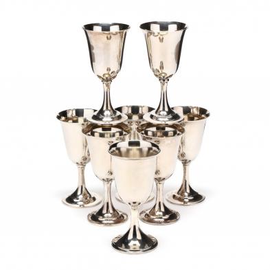 Including (7) International "Lord Saybrook" goblets, pattern number P664 (6.75 in.); and one by S. Kirk & Son, pattern number 72 (6.75 in.). No monograms.