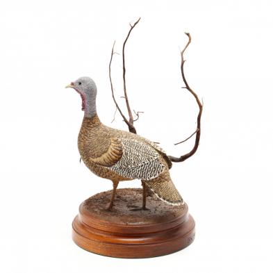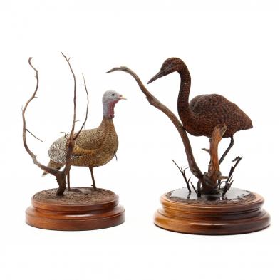 The first of a wild turkey (HOA 11.25 in.), the second of a water bird (HOA 11 1/8 in.), each signed "B. W. Ackiss" to the hardwood stand, circa 1980s.
