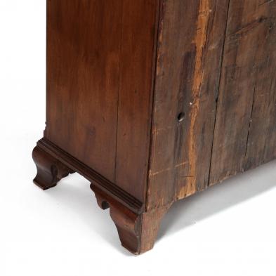Southern Private Collection Good estate condition overall; upper outer most cornice molding restored; later brasses; later drawer guides; several lip repairs; later bracing to left rear foot and loss to spur; left front side foot facing original but with hairline crack.