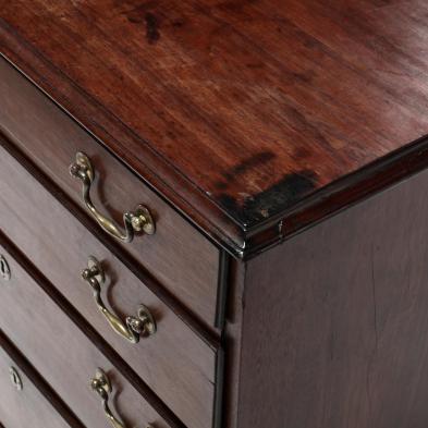 Top with repairs to molded edge, especially at sides; drawer runners and drawer guides replaced; replaced pulls; front right side foot facing cut and tipped; bracket feet appear original but now with later screws; front left foot original but with hairline cracks.