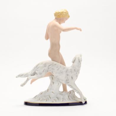 Royal Dux Porcelain of a Young Nude Running With Her Dog