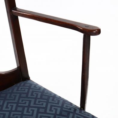 Southern Private Collection Later upholstered slip seat; break and repair to both arm supports at joint; later molded seat rail edge.