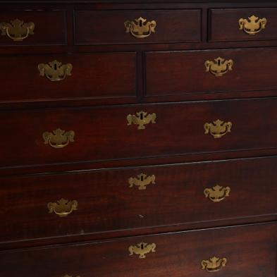 Attributed to Piedmont North Carolina, circa 1800, poplar secondary, dovetailed case, applied cove molded cornice, three upper side-by-side drawers above two side-by-side drawers above four long drawers, all lipped and graduated, applied base molding and raised on old but later ogee bracket feet.