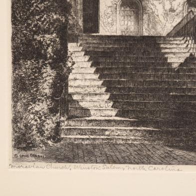 Moravian Church, Winston-Salem, North Carolina, both pencil signed and titled, from Orr's series of North Carolina landmarks completed between 1939-1952, with full margins, presented in original matting from Orr's studio with his pencil inscription, unframed.