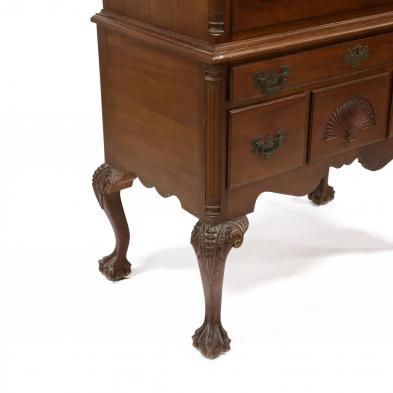 20th century, two-part form, broken arch bonnet with rosettes and flame finials, upper and lower shell carved drawers, fluted quarter columns, cabriole legs with acanthus carved knee, on ball and claw feet.