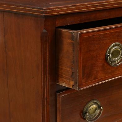 Early 19th century, poplar and yellow pine secondary, top with line inlaid edge and border, four graduated drawers with cockbead, banded and line inlay, with inlaid escutcheons, canted corners with line inlay, shaped skirt with repeating banded and line inlay, on French bracket feet.