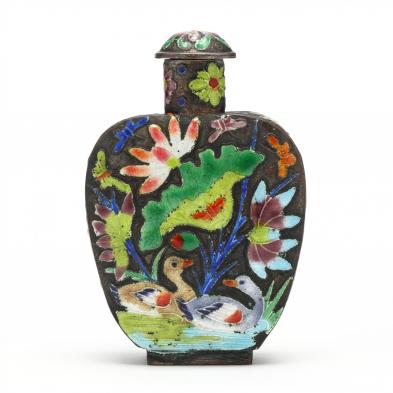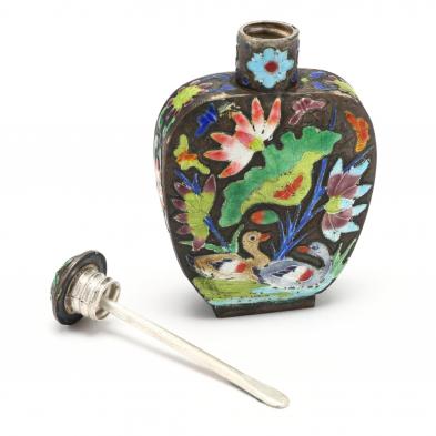 Late 19th or 20th century, includes a Chinese silver filigree snuff bottle of hexagonal shape and decorated with floral motifs, twist cover with spoon, and a small double snuff bottle, rectangular in shape with twist covers and spoons, enameled Chinese characters to one side and enameled flora to other, and a metal snuff bottle inlaid with bright polychrome enamels, twist cover with spoon, stamped CHINA to underside.