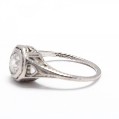 The old European cut diamond weighing approximately .56 carat (J color, VS2 clarity) bead and bezel set in the platinum mount with engraved detailing, stamped for platinum.