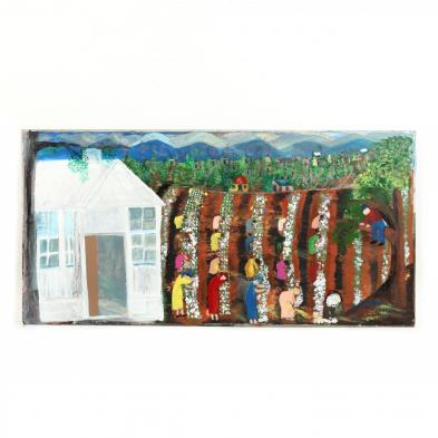 Oil on artist's board, rows of colorfully clad women bend over cotton plants, unsigned.