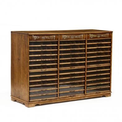 Early 20th century, maple case with (36) glass front drawers with dividers, original decal to upper panels, raised on later short bracket feet.