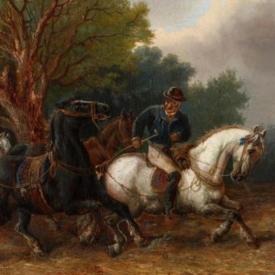 Oil on canvas (lined), signed at lower right, presented in an early 20th century gilt Art Nouveau style frame.