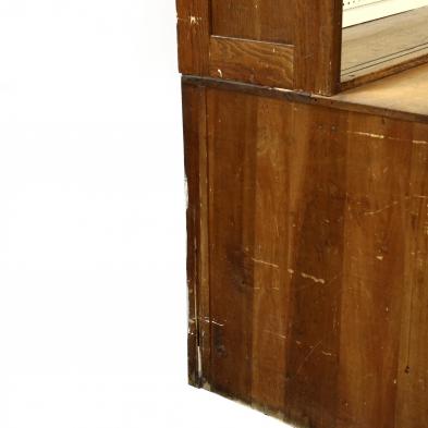 F.D. Warren Mfg., Chicago, circa 1890, two part oak case with upper open cabinet having later painted pegboard; lower cabinet with four hinged sliding paneled doors with shelved interior, flush base.