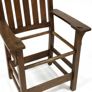 Early 20th century, quarter sawn oak, tapered crestrail, five back slats, through tenon arms, on stretcher base, stamped.
