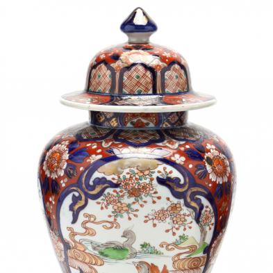 Late 19th century, includes two baluster jars with domed covers having pointed finials, hand painted in iron red, cobalt blue and white with touches of gilt and some green, shaped medallions alternate between scenes of bamboo and pairs of ducks.
