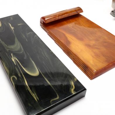 1930s, including a damper box, blotter, ink well / pen tray combo, Pixie pencil sharpener, rectangular plinth, card holder, and a Caryacraft pad holder.