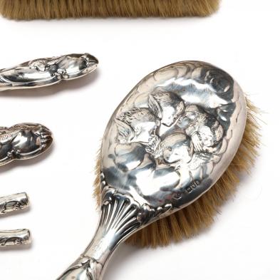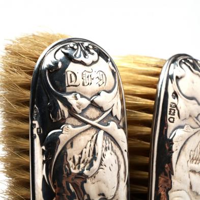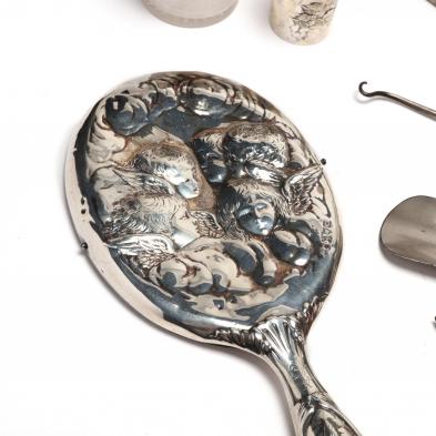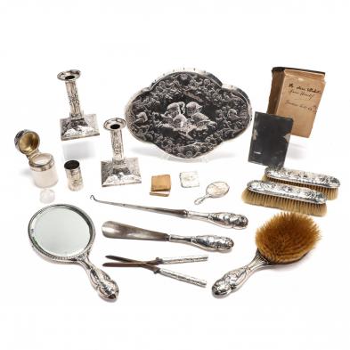 (15) pieces including: a pair of candlesticks with London (1898) (5.75 in); a shaped gallery tray with London (1900) hallmarks (12.25 x 9 in.); (2) clothes brushes, London (1898 and 1913); a hand mirror with London (1898) hallmarks (some loss to silvering and scratching to glass); a button hook with London (1899) hallmarks; a pair of curling irons with London (1900) hallmarks; a shoe horn with London (1900) hallmarks; a hairbrush with London (1896) hallmarks; a small traveling mirror with London (1900) hallmarks (4 in.) (broken mirror); a dresser jar with rubbed date letter (chipping to interior glass cover); a cylinder lacking glass liner with Birmingham hallmarks (.6 troy oz.); a miniature copy of