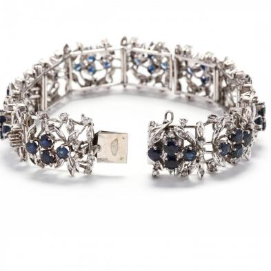 In a foliate motif and comprised of rectangular links each prong set with four round cut blue sapphires and with single cut diamonds, completed with an integrated clasp, stamped 18K. Total diamond weight approximately 1.78 total carats (H-I color, SI clarity) and total sapphire weight approximately 13.2 carats.