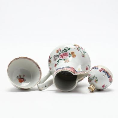 18th-19th century, Chinese export porcelain dish, small tea cup (a few minor nicks to rim), covered teapot (chip to foot; chips with repair to spout), footed bowl with star edges (a few chips to rim; a chip to the foot), all decorated with similar floral and diaper patterns, footed bowl has key border on foot and painted with peaches on the exterior sides.