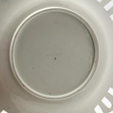 With date stamp "P" (1861), a round reticulated basket with basket weave under-plate and cover, the cover features a full bodied mushroom finial, blue enameled decoration throughout.
