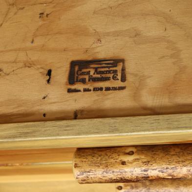Idaho, late 20th century, pine and cedar, top with free-form edge, two drawers, raised on trunk legs, labeled.