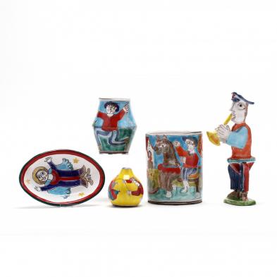 1980s, including a figure playing a horn, small oval dish decorated with an angel, small yellow bud vase with figure holding balloons, a cylindrical vase decorated with figure on horseback, and a conical vase decorated with man holding balloons, signed.