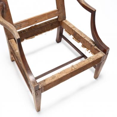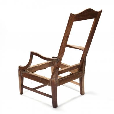 Lacking upholstery; finish wear throughout; one stretcher rail replaced.