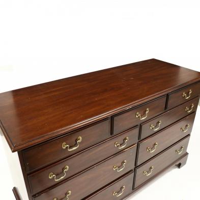 Late 20th century, rectangular top with molded edge, case with nine graduated lipped drawers, on shaped bracket feet, with rectangular conforming mirror, labeled.