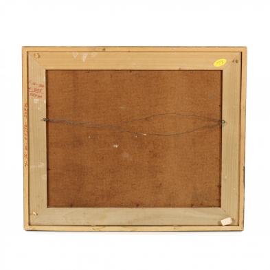 Oil on Masonite, illegibly signed and dated 77 at lower right, presented in gilt and painted frame and liner.