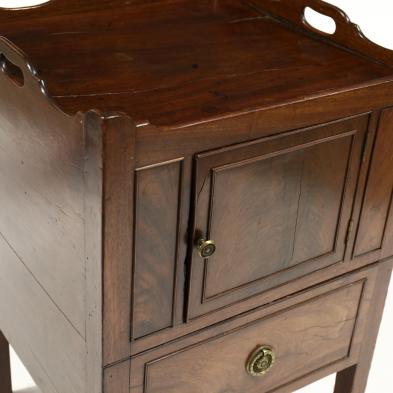 Late 18th century, pine secondary, top with scalloped gallery with handles, lower hinged paneled door with open interior over a single drawer with applied trim, raised on straight square legs, retains a vintage Otto Zenke label.