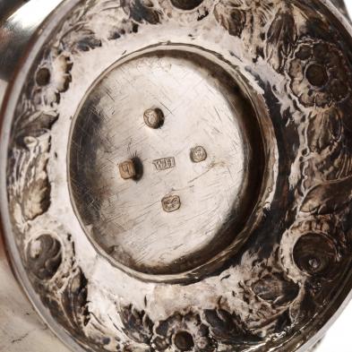 The teapot with "WH" sponsor's mark, London (1823) hallmarks, with armorial engraving to one open cartouche (5.25 in.); the creamer and sugar with rubbed sponsor's mark, London (1825) hallmarks, no monograms. Each with hand-chased floral and foliate designs, the sugar and creamer both raised on four bracket feet, the teapot with domed foot.