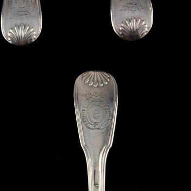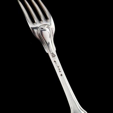 (33) pieces, including: (18) forks (each approximately 7.75 in.); and (15) spoons (each approximately 8 1/8 in.). Various hallmarks, including (5) forks and (5) tablespoons with mark of Paul-Andre Chambord (Brest, circa 1772-1773), remaining marks are of other Paris and provincial makers, several with rubbed marks; each fork and all but one spoon with shell design to handle; (14) forks and (10) tablespoons engraved with coat-of-arms of French nobility and/or monograms.