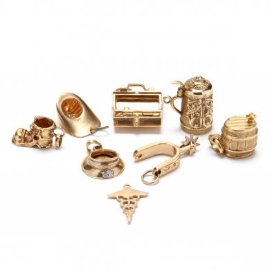 To include: a jug testing 14KT (7/8 in.); a shoe testing 18KT (3/4 in.); symbol of medicine stamped 14K (3/4 in.); a fireman's hat stamped 14K (7/8 in.); a policeman's hat stamped 14K (13/16 in.); a barrel with Italian hallmarks and stamped 750 (7/8 in.); a spur testing 14KT (1 in.); and a Red Cross bag testing 14KT (3/4 x 5/8 in.).