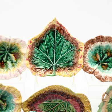 To include: five Etruscan leaf (9 in.) (three with tip chip); a small green one marked "Wedgwood"; two butter pats (one missing tip); three others (two have glaze shears to underside).