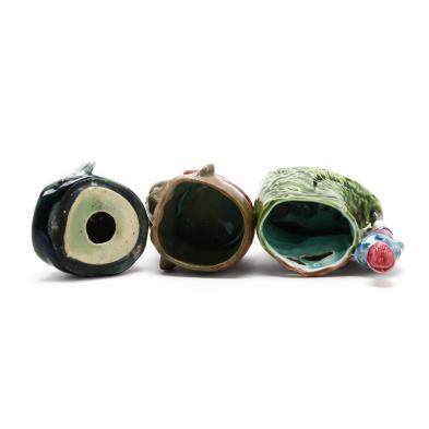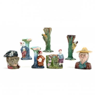 Four bud vases (good condition, chip to man's finger); a monkey with a removable hat; a man with a hat cover (hat broken and glued); a low vase.