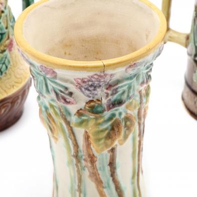 Plates with varying designs (four with rim hairlines or other conditions); a vase with long stemmed flowers (rim hairline); a holly decorated pitcher (rim and base hairline); a Dahlia pitcher (8 in.)