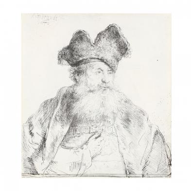Etching and drypoint on laid paper, 1640, a 17th century/lifetime impression of Bartsch’s second state (of 2), Hind, Biörklund-Barnard and Usticke’s second state (of 3), sheet bears a portion of the "Coat of Arms of Amsterdam" watermark (Ash/Fletcher 1.G.a; Hinterding G.a.a., which is similar to the impression housed in the collection of the Metropolitan Museum of Art, New York), matted and framed. Bartsch 265 ii/ii; Hind 170 ii/iii; Biorklund-Barnard 40-A ii/iii.