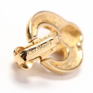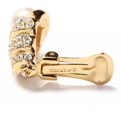 To include: a large gold tone bead and faux pearl necklace, signed SJ for St. John (60 in.); a gold tone lozenge and barrel link bead necklace signed SJ for St. John (60 in.); a gold tone sundial bead and faux pearl necklace signed SJ for St. John (60 in.); a gold tone carved bead and faceted black bead necklace signed SJ for St. John (65 in.); a pair of gold tone ridged rhinestone and faux pearl clip on earrings signed Chr. Dior;1( 1/8 in.); a pair of gold tone rhinestone and faux pearl door knocker clip on earrings signed Chr. Dior (1 in.); a pair of double oval red rhinestone dangle earrings (2.25 in.); and a pair of gold tone floral motif red and colorless rhinestone clip on earrings signed Japan (1.25 in.).