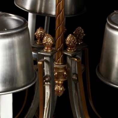 Late 20th century, five arms with two lights each, having painted metal shades, with gilt metal acanthus leafs, with ceiling cap and chain.