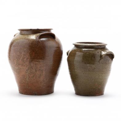 19th century, one and two gallon size, lug handles, tapered ovoid form. Capacity denoted with slash marks on both crocks as is typical in many SC pieces. Slash marks on the base of the jar possibly denote the maker to be Rev. John Landrum.