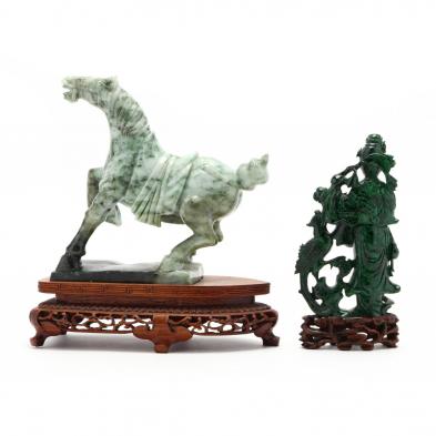 20th century, includes a malachite Guanyin sculpture with fitted wooden stand attached, and a white and marbled green horse sculpture with fitted wooden stand attached.