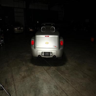 With a silver exterior and black leather interior. The interior features some retro features such as the round dials and gauges, including the pod mounted on the center console. Convenience features such as power seats, windows, convertible top, mirrors and locks, along with cruise control, intermittent wipers, AM/FM/CD with Bose speakers, and automatic headlights with fog lights. The SSR has 23.7 cubic-feet of cargo space in a carpeted bed with the optional wood trim that is capped by a nice hard tonneau cover. It has a few really unique touches including bow tie side markers, interior parts trimmed in the exterior color, and 20" chrome star wheels in rear and 19" in the front wrapped in fat 295/40R20-19 Goodyears.