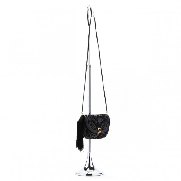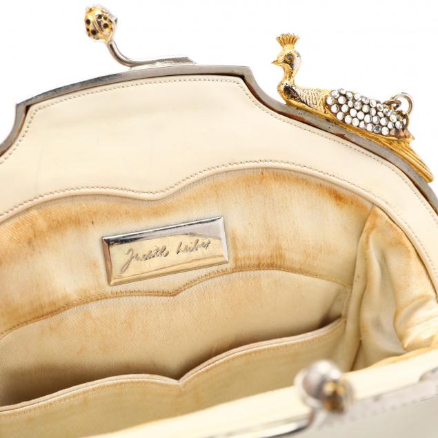 The first is composed of cream colored leather with a silver tone frame embellished by peacocks and set with crystals, long shoulder chain (7.75 in.) (interior stains; missing numerous crystals; marks to leather); the second, a structured bag with arched handle, black crystal set body, mushroom push lock closure, interior with comb and mirror (missing a few crystals; clean interior) (6.75 x 6 in.); the third is composed of a textured leather with raised design embroidery, cabochon set clasp, shoulder strap with tassel, interior with mirror (good estate condition) (5 x 6.5 in.)