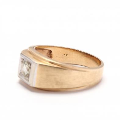 A signet style ring with a round brilliant cut diamond weighing approximately .46 carat (O-P color, SI1 clarity) set in a square setting with milgrain detailing, stamped 14K.