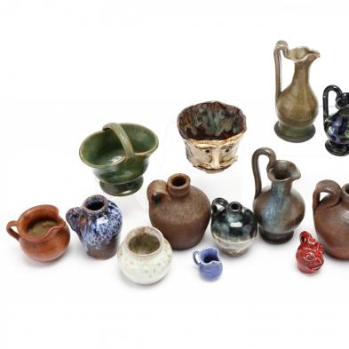Some signed to include: Neolia and Celia Cole; a Seagrove (Dorothy Auman) pitcher; a signed face cup. Jugtown egg cup, others mostly unsigned.