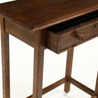 Early 20th century, rectangular top, with single drawer, on straight legs with chamfer and stretcher base.