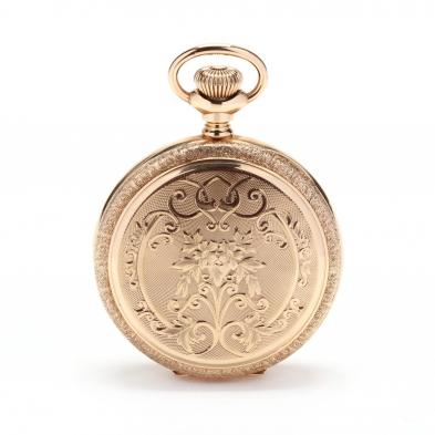 Circa 1903, serial #12583244 and twenty-three jewels, stem wind and set, the white dial with black Arabic numeral hour markers, outer minutes register with subsidiary seconds dial at the 6:00 hour and with blue steeled spade hands, movement signed A.W.W. Co. / Waltham Mass. / Riverside and curvette stamped 585, the watch housed in a finely engraved case with scroll and foliate motifs and with engine turn detailing, signed Keystone / 4726574 and stamped 14K .