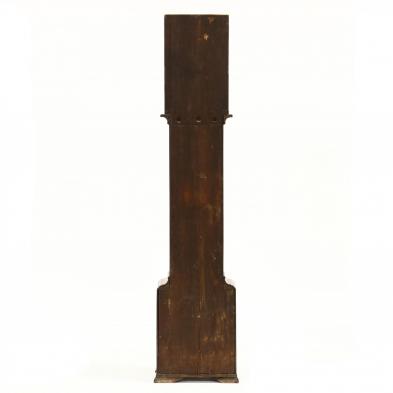18th century, white pine secondary, painted metal face, with calendar dial, hood with later turned finials, broken arch pediment, with pinwheel inlays, fully turned columns, waist door with scratch bead and inlaid escutcheon, base with raised panel on short ogee bracket feet, with pendulum and weight.